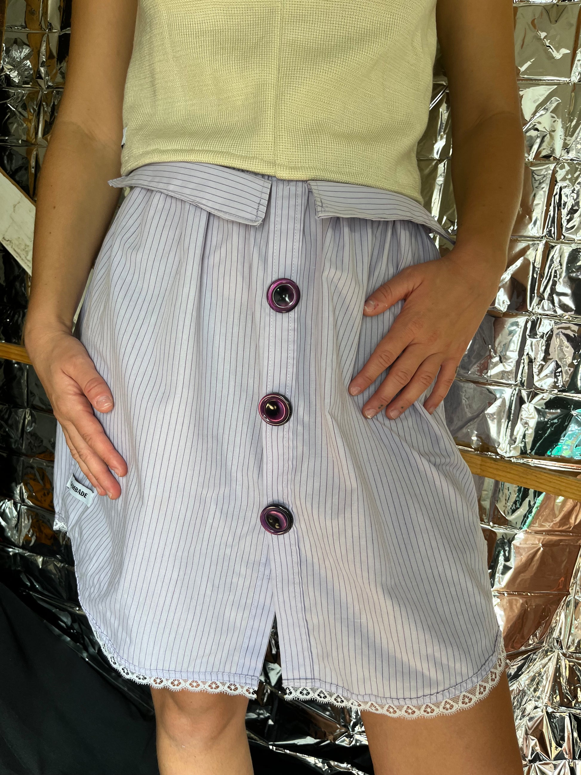 Taille élastique pour un confort, accompagnée de sa délicatesse dentelle sur le bord. Boutons vintage choisis avec soin et col de chemise revisité en ceinture.