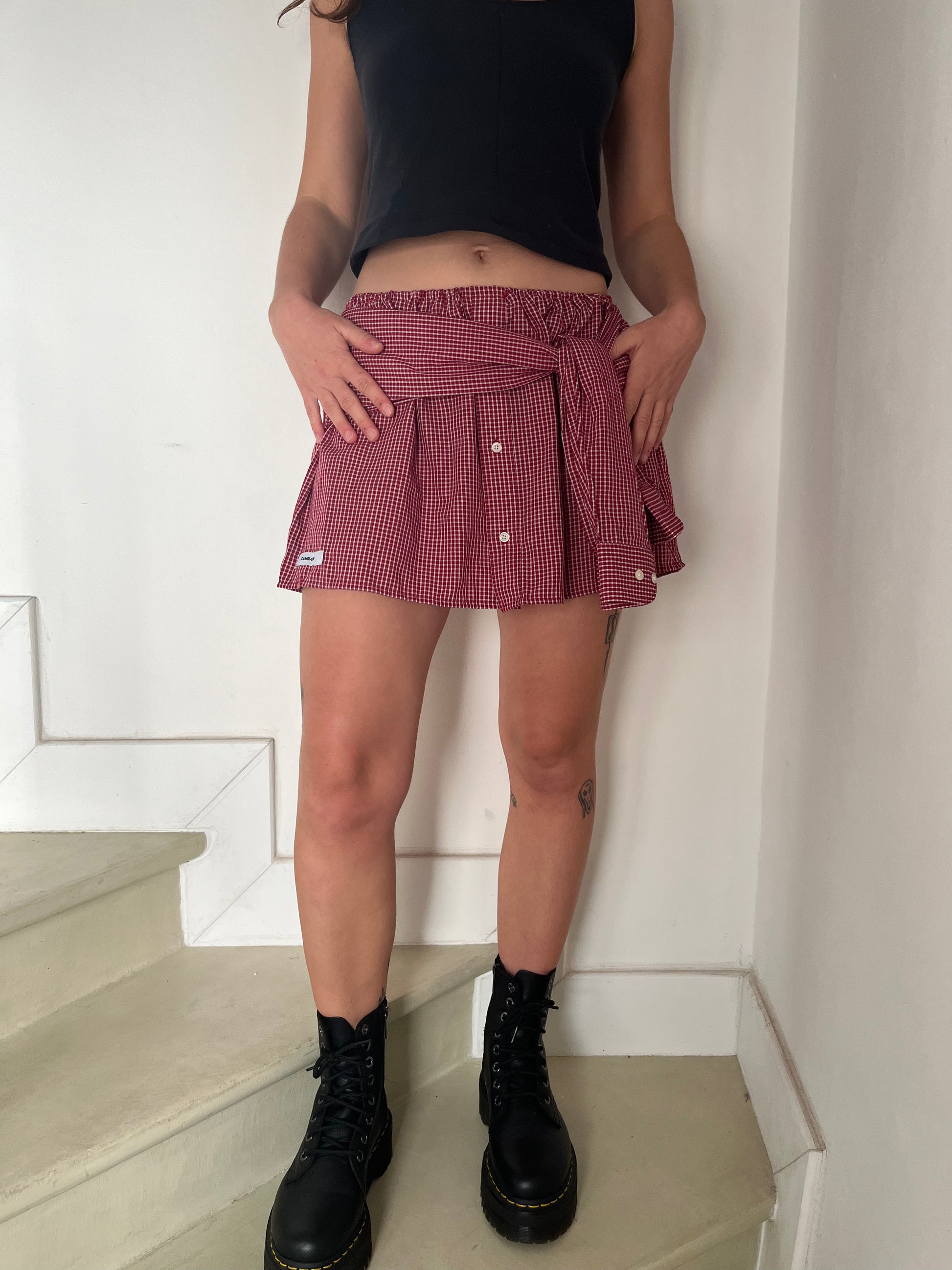 Mini jupe avec son nœud upcyclée à partir d’une chemise de second main.