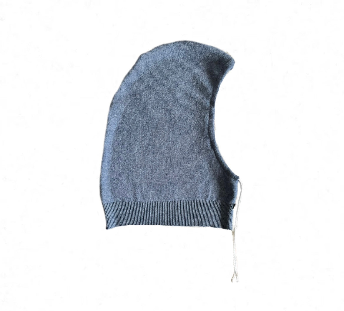 Cette cagoule unique est upcyclée à partir d'un pull de seconde main. Le cordon est de seconde main aussi.